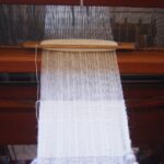 I use a floor loom to weave all of my fabric. This timeless technology is used to systematically raise and lower each individual thread. This method has the ability to create countless patterns, which depend on the specific order that the warp threads are set up on the loom and the pattern in which the pedals are pressed.